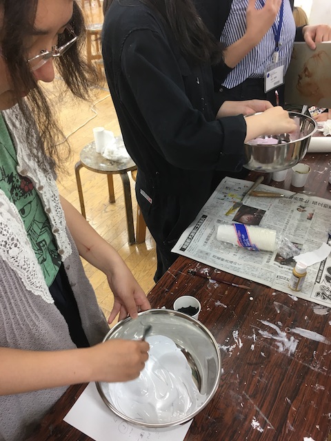 そして紙に塗る有色下地をジェッソと顔料ペーストでつくります。新任の品川美香先生とともに、画集と見比べながら色味の濃さを調整してゆきます。