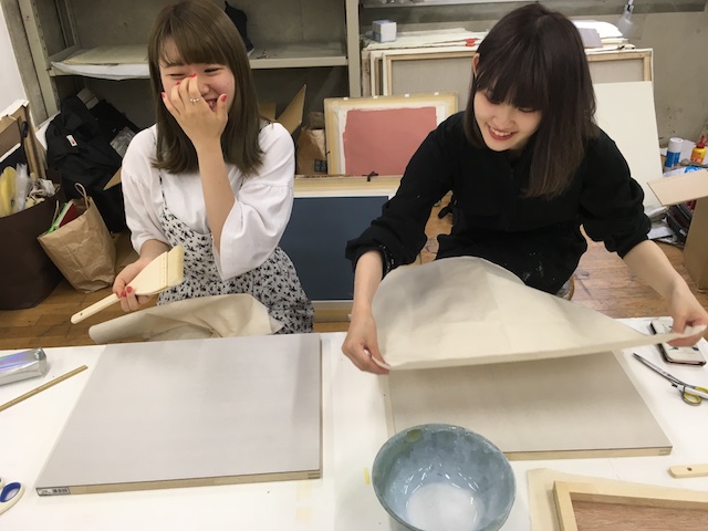 写真は木村先生のジェッソを重ねたときの見本と、岡田先生のきれいに整えられた支持体パネルの作品です。これを見ると1年次学生もやる気になったのではないでしょうか。