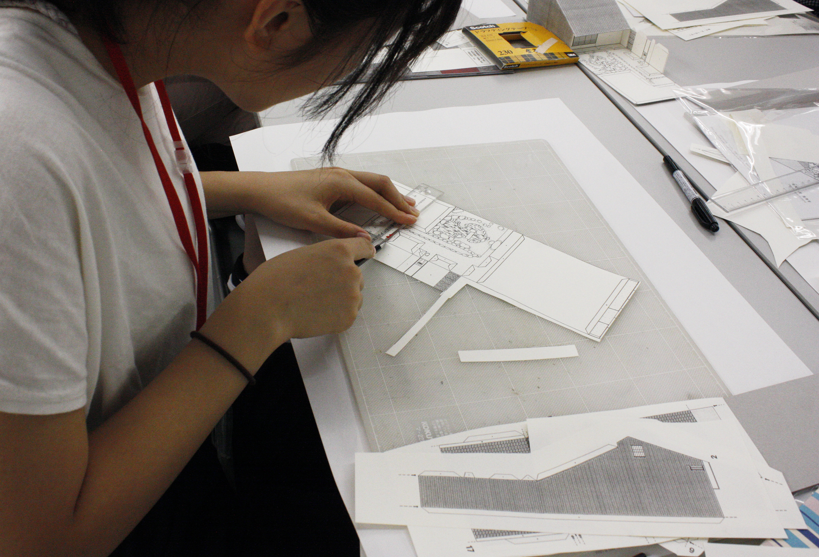 作業中には教職員や学生スタッフが見て周り、模型制作に欠かせないカッターや定規などの道具の正しい使い方の指導がありました。