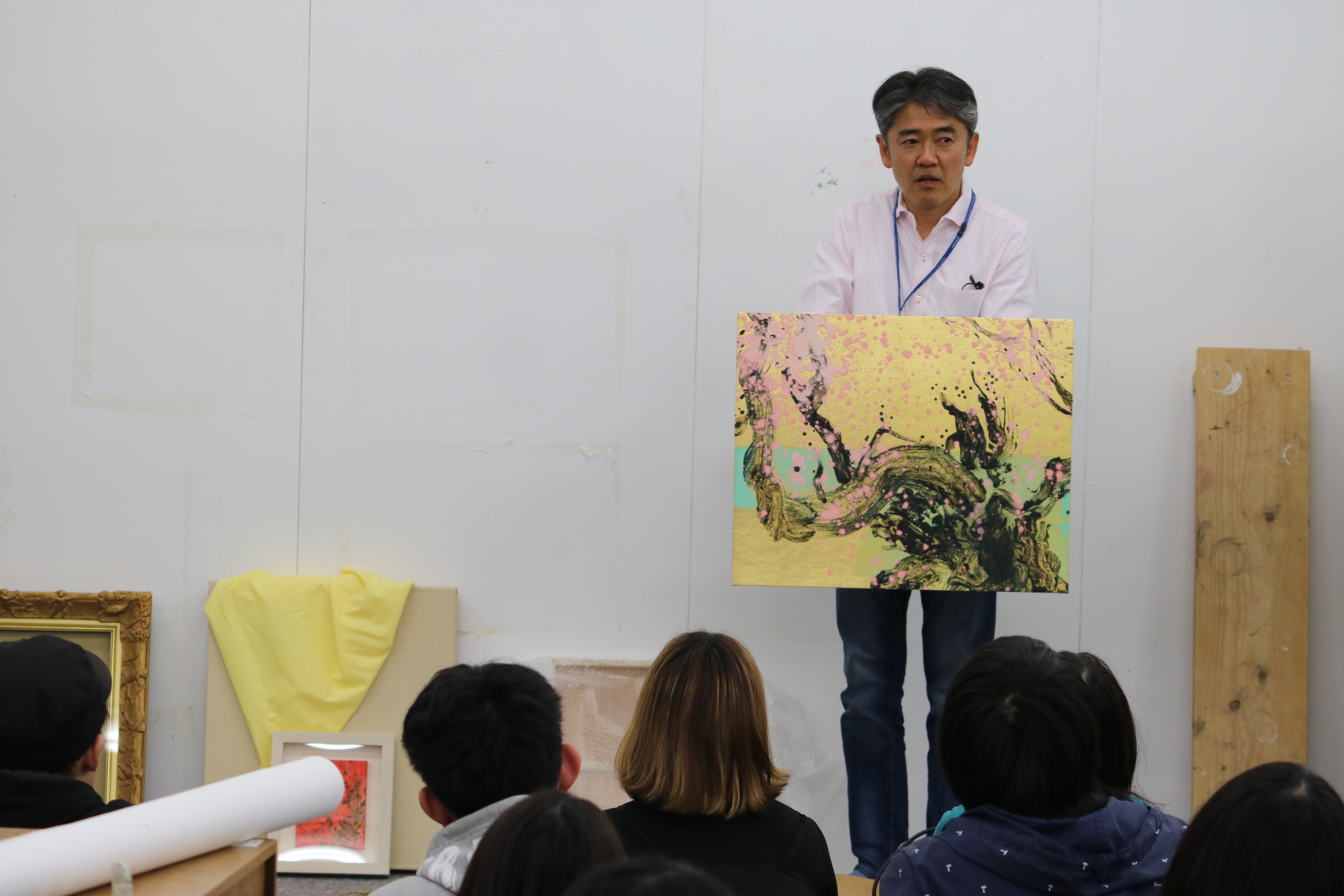 今回は、新しく入ってこられた先生方がいらっしゃるのもあり、挨拶も兼ねて日本画の先生方全員の作品を学生の皆さんに見ていただこうという企画でした。