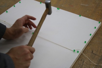 ▼ベニヤにボンド付けして、上からカリクギで仮止めします。
