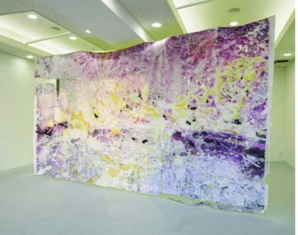 I:京都市美術館の別館。みんなで持ち上げてもらって。ひょいってかけて。そっからなんか、これきっかけというか、自分のしたいことに素直になっていったていうか。こうしなきゃって思ってやるのしんどいしね。素材も興味あるものから手を出して、転写を始めたり、転写した上から描いたり、グルーガン使ったり、木の枝とか、素材とかも変わってきたり。壁にじゃなくて、修制も展示場所の空間の中央に吊るしてたり、あらゆる意味で解放されていく感じがしていて。
