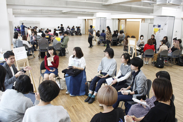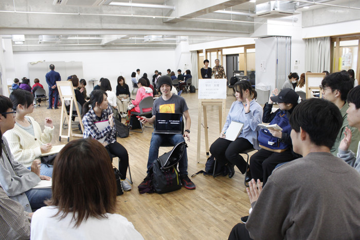 授業は、いわゆる講義形式ではなく、1回25分の「セッション」(ゲストのプレゼン+質疑応答)を4回おこなうという内容です。自分が聞きたいゲストのところへ移動、円になってお話を聞き、質疑応答。こうして順に各ゲストをまわっていくという参加型スタイルです。
