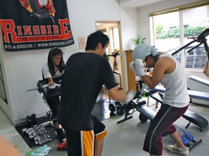 サンドバッグを打ち込んだり、2人1組でスパーリングしたり。