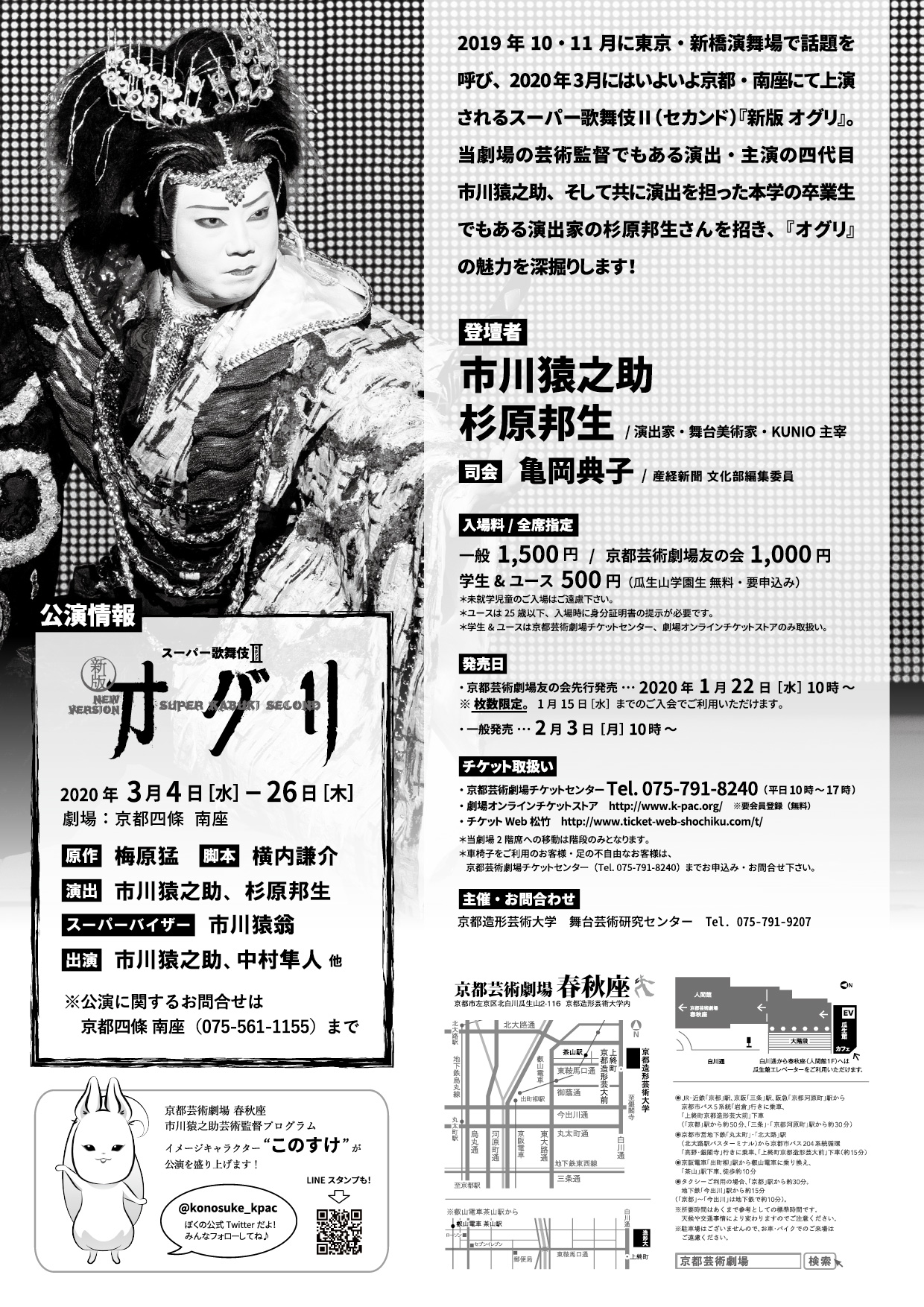 2019年10・11月に東京・新橋演舞場で話題を呼び、2020年3月にはいよいよ京都・南座にて上演されるスーパー歌舞伎Ⅱ(セカンド)『新版 オグリ』。当劇場の芸術監督でもある演出・主演の四代目市川猿之助、そして共に演出を担った本学の卒業生でもある演出家の杉原邦生さんを招き、『オグリ』の魅力を深掘りします!