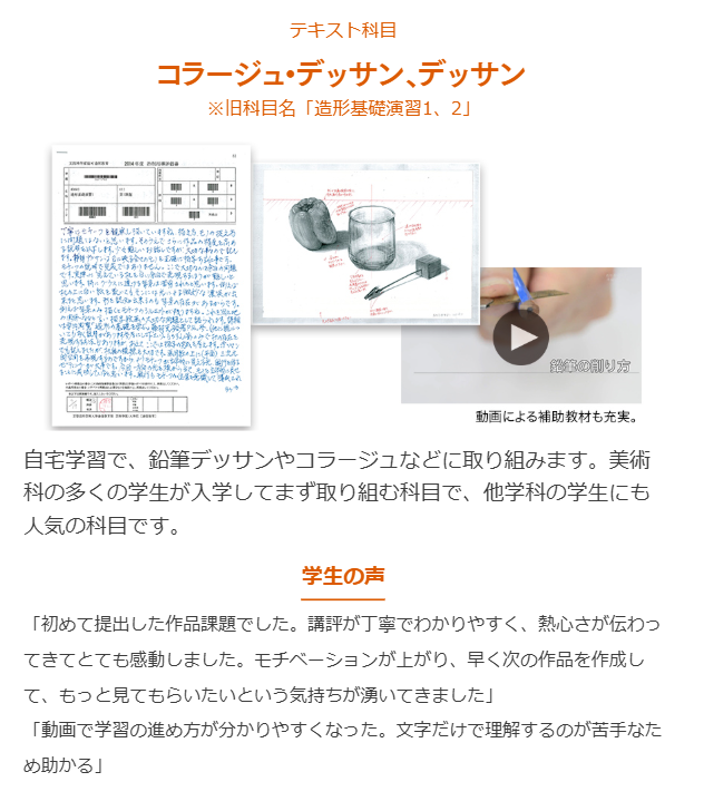 コラージュデッサンやデッサン科目は、他学科・コースの学生にも人気の科目です。実際制作をするコースではなくても、こういった制作の基礎を知ることがご自分の専門の学びにも必ずつながってきます。スクーリング科目で学ぶデッサンの科目もあります。