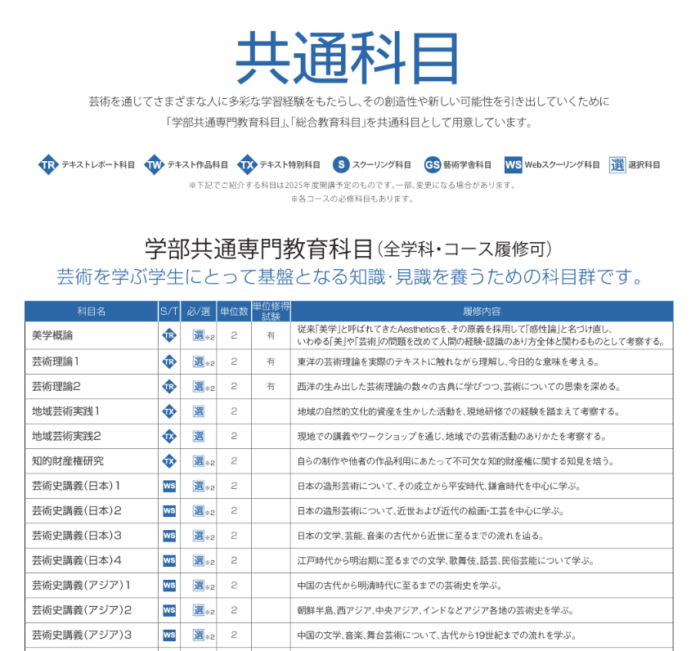 そのほか共通科目についてはウェブサイトから2025年度 科目概要一覧(PDF)にてご覧いただけます。芸術の制作基礎や通史のほか、人文、社会、自然といった学問をバランスよく取り揃えています。語学や体育などもあります。