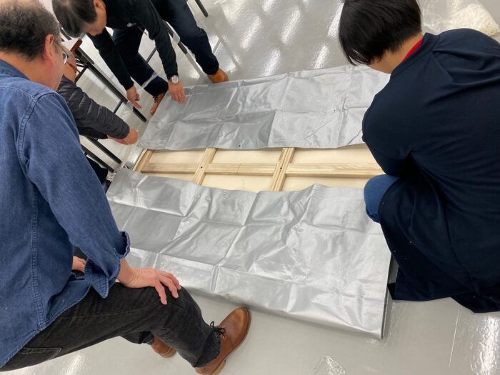 額付け作業は市販の仮縁でも自作の木枠でも選択自由ですが、みなさんを見ていると木枠を選ぶことが多いです。自作の木枠は複数名で協力して木材をカットしたり、ずれないように気をつけながらキャンバスに木枠を釘で打ち付けていきます。和気あいあいとしたムード。