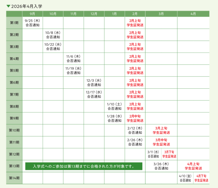 最終の第14期に出願・合格された場合は、4/13以降に学習開始となります。