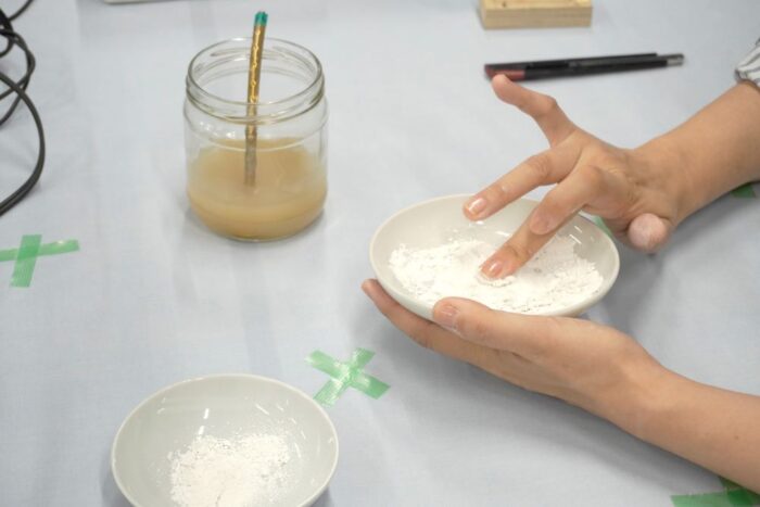 空擦りした胡粉を絵皿に必要量とり、そこへ膠を1滴ずつ垂らしながら全体に膠が馴染むように練り込んでゆきます。