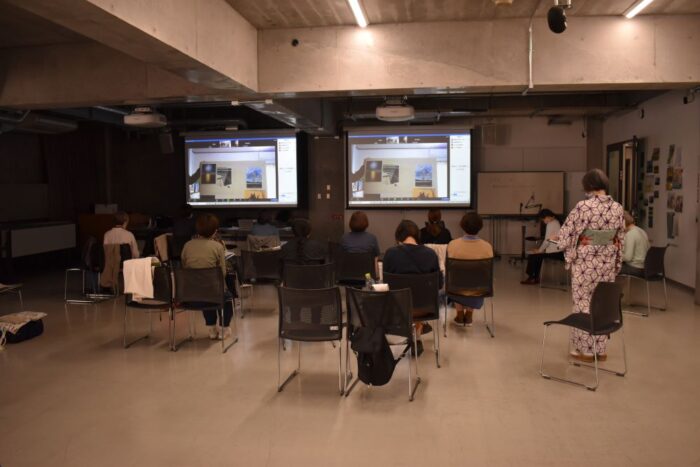 染の技法を使った作品を作る授業と、織の技法を使った作品を作る授業に分かれているというのは前回も書いた通りです。まずは全員集合して年間の進め方について説明を行いました。瓜生山キャンパスに登校するか、自宅からオンラインで出席か、どちらかを選択できます。