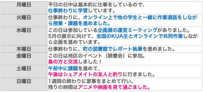 村上さんは日中、島の仕事をしながら、夜や週末に授業や課題に取り組んでいます。
