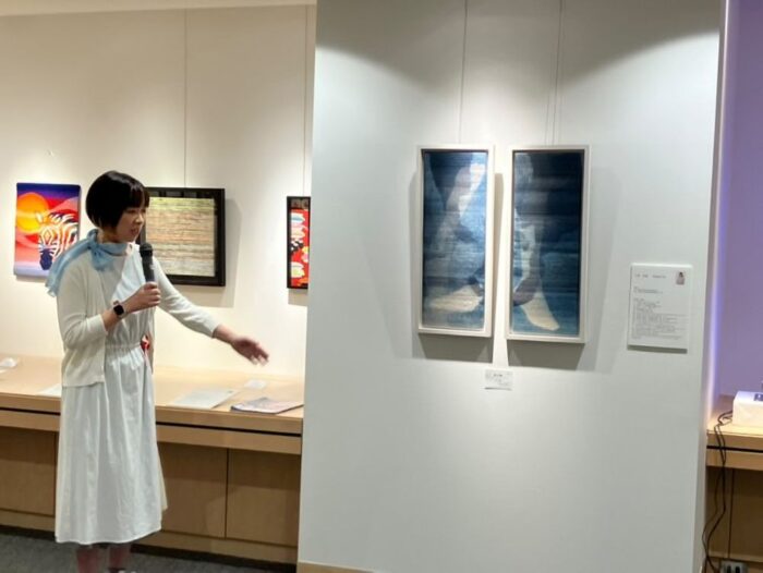参加された学生・卒業生は卒業制作とは違う新たな経験をされたことでしょうが、染織コースではテキスト課題に【卒業制作計画書】があり、作品をどのように完成までに進めるかを考えます。そういった基本がありますので、今回の企画展も卒業してすぐに対応できたのではないかと思います。展覧会でのギャラリートークは自身の作品を皆さんに紹介できる機会ですが、これもスクーリングで何度も自身の成果物について説明をしているので、今回のギャラリートークでも皆さん落ち着いて自身の作品について説明をされておりました。