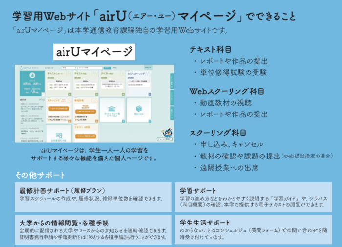 「airUマイページ」とは、本学通信教育部独自の学習用webサイトです。