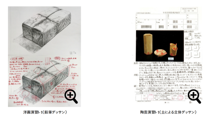 各コースの専門科目についても、実際の制作過程を講師が手元のアップ映像で丁寧に解説。作品を見せながら質疑応答ができる授業もあります。