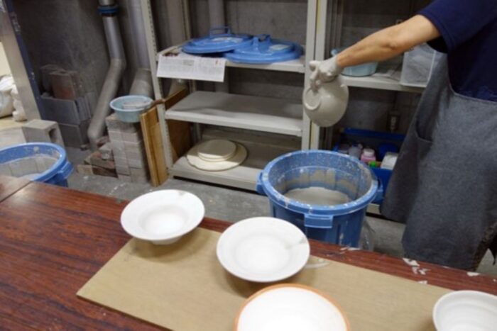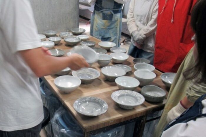 前半では土練りや水挽き、削り、白化粧と「成形」にあたる部分を終えています。大学では数週間の間に、「乾燥」と「素焼き」を行なっています。ですので、後半では素焼きの工程までを終えた作品がありますので、「施釉」と「本焼き」を行うことになります。