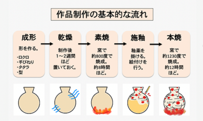 成形→乾燥→素焼き→施釉→本焼き