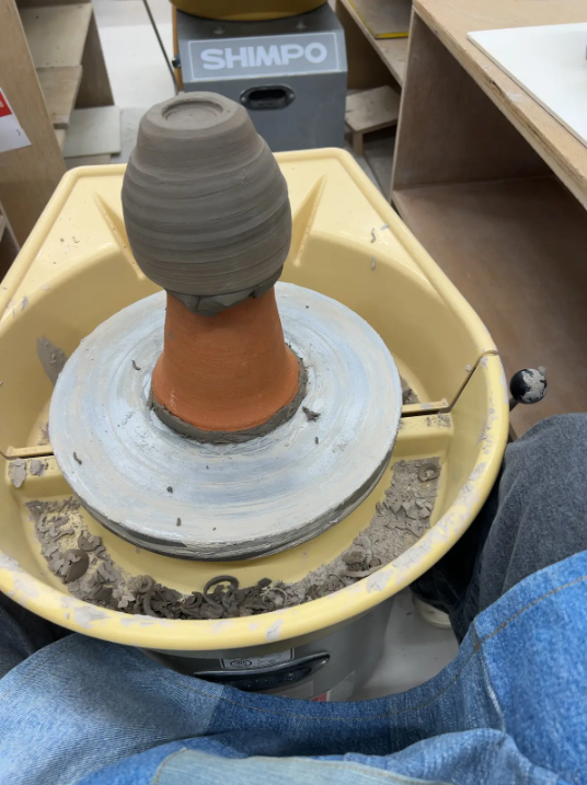 藝術学舎のロクロの授業で、高台の削り出しをしている様子