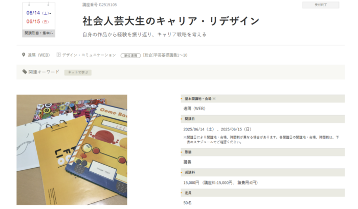 藝術学舎(本学の一般公開講座/通信教育部との単位連携制度あり) として開講される、「社会人芸大生のキャリア・リデザイン 」講座。