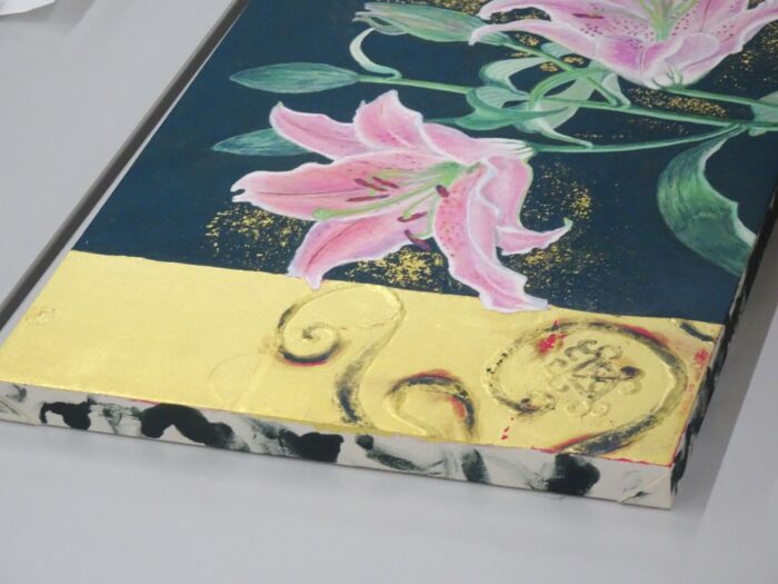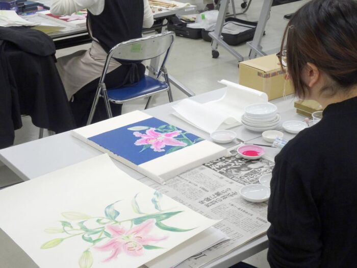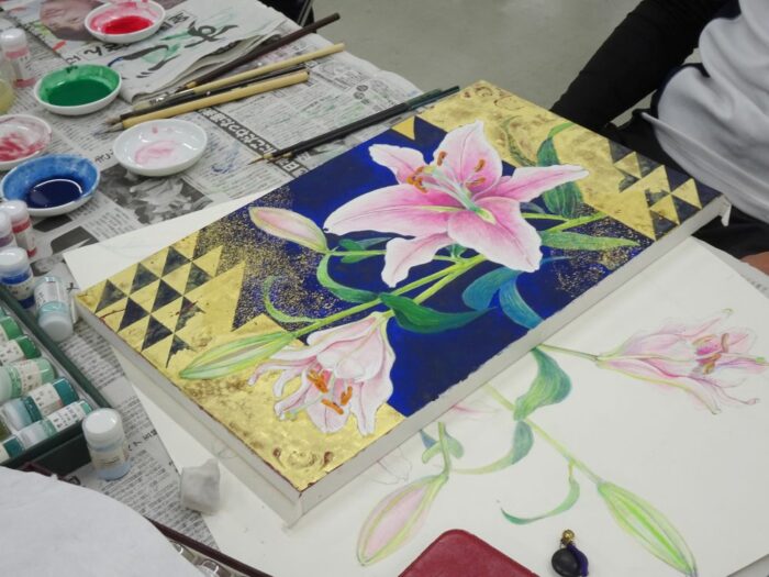 植物制作の授業は【日本画III-1(植物写生)】の次に設定されている授業です。写生の授業で描いた百合の花を日本画の作品として描く内容ですが、カリキュラム上では授業を順番に受けていけば、ここではじめて箔を使った表現を学ぶことができるという内容になっています。