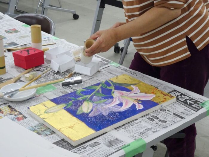 授業の後半では砂子という技法を学ぶことができます。箔を細かく切り崩して画面に撒く表現なのですが、うまく撒いたり、しっかり画面に定着させるために先生によるレクチャーも実施されました!