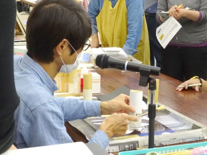 此方は外苑キャンパスから 小瀧雅道先生による箔の解説と砂子のレクチャーの様子です。