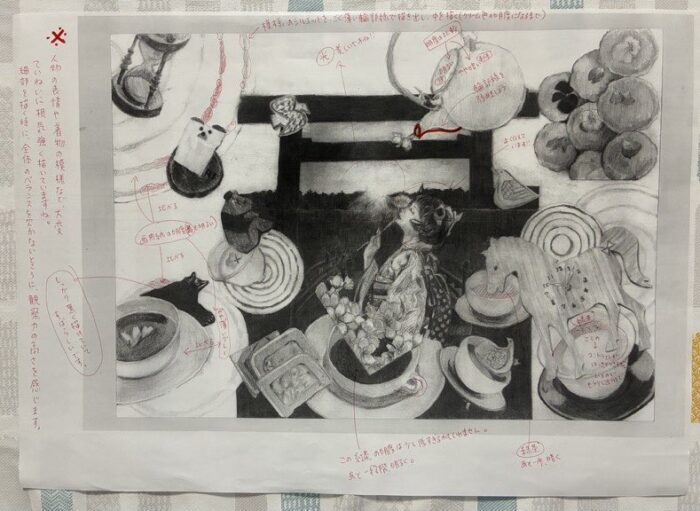 デッサン自体、初めてしっかりと取り組みましたが、とても楽しく学ぶことができ、非常に勉強になりました。作品は郵送で提出しましたが、戻ってきた際の添削が驚くほど丁寧で、細かくご指導いただいたことに感動したのを今でもよく覚えています。