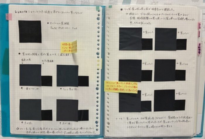 ポスターカラーを使って色カードを作る課題は、時間はかかりましたが、色についてさまざまな角度から向き合う良い機会になりました。アナログ画材を扱うのが好きなので、写真を見ながら混色を試す作業はとても楽しく、色の奥深さを実感できました。