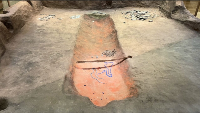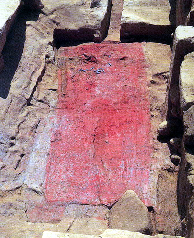 糸島市平原遺跡の埋葬施設に朱がまかれている様子(筆者撮影)