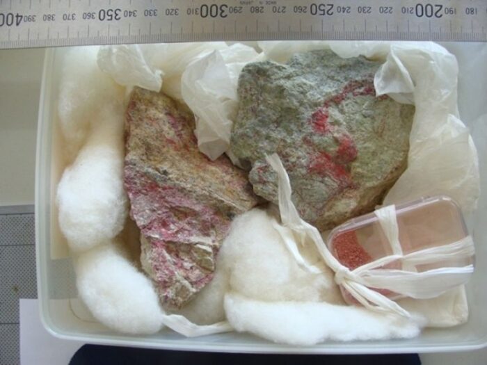 三重県松阪市産出の辰砂(朱の原料)(筆者撮影)