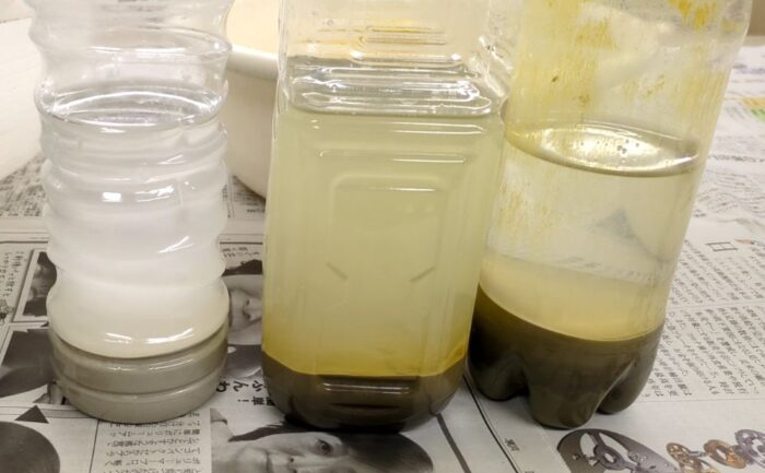 沈殿の酷くない釉薬はこうしてペットボトルの容器に入れ保管したりすると振って攪拌を出来るので便利です。