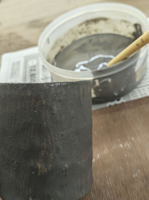 成形をし、少し乾燥をさせた器に黒化粧を筆で塗り重ねます。