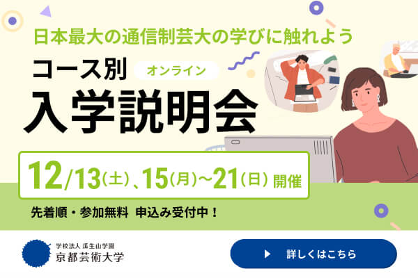 A.他大学との検討という意味では、通学しなくてもよい割合や、私のような初学者に門戸を拡げている印象で、京都芸術大学に出願しました。