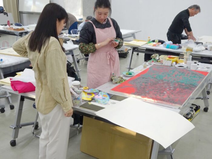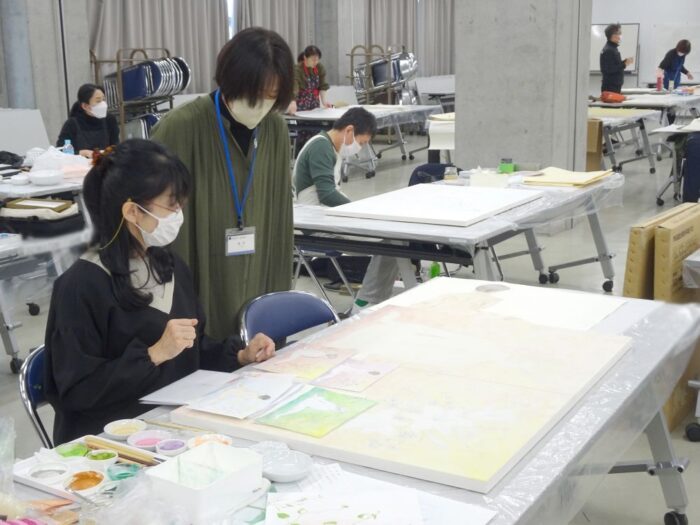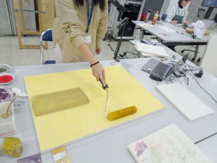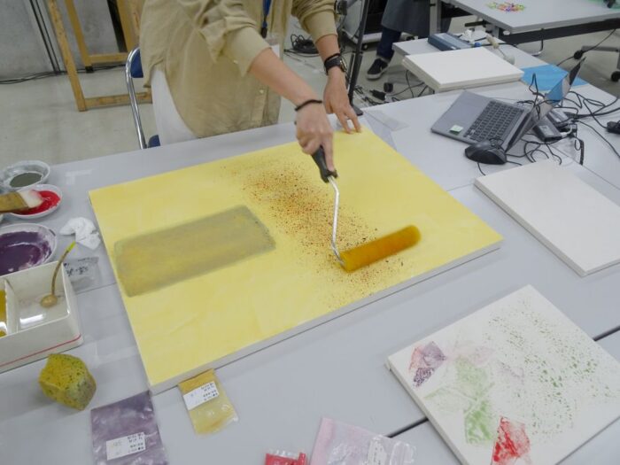 1日目の午前には山本真澄先生によるマチエールの実演が行われました。今回は、スポンジとローラーを使った表現の紹介です。色に深みを出していくための重ね方のコツを教えていただきました!