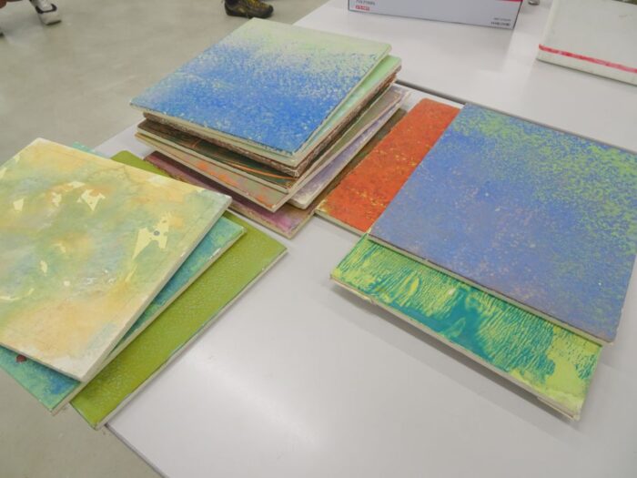 研究室のマチエールサンプル 様々な画材をつかってさまざまな表現をすることができます。