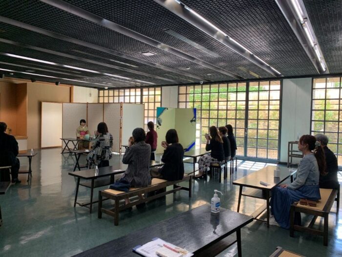 この科目は茶の湯文化のもつ多様性を理解することを目標としており、完全オンライン授業の日程と、対面+オンライン授業の日程があります。11月に対面+オンライン授業の日程が実施されました。とくに対面で実施した授業風景をみてみましょう。