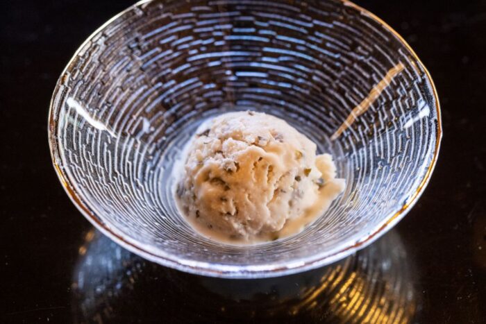 デザートのしば漬けとクリームチーズのアイスは、食べてみると不思議なバランス。酸味と甘みが絶妙で、新しいデザートの可能性を感じさせてくれました。