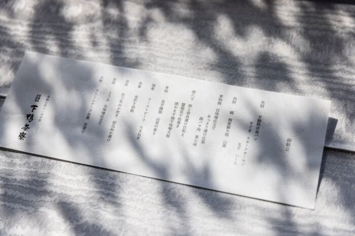 そして、いよいよお待ちかねの昼膳。下鴨茶寮の本山料理長が、この日のために西利さんに足を運び、漬物と真剣に向き合って仕立てた特別なコース。なんと、先付からデザートまで、全ての料理に西利さんの漬物が使われているという構成でした。