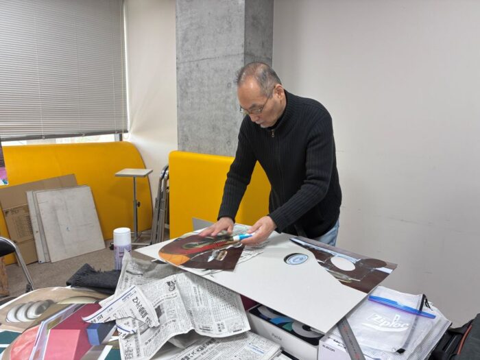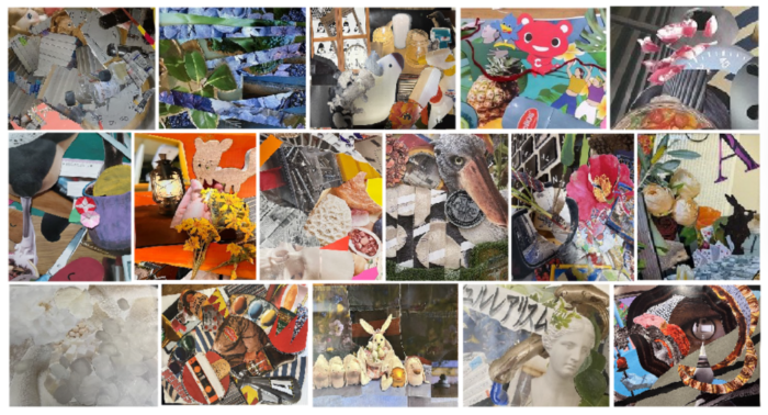 皆さん材料不足もなくwebで授業内容も確認されており、デモ(上)以上に手際よくコラージュ作業をされていました。効率良く学ぶには事前準備がとても大切ですね!