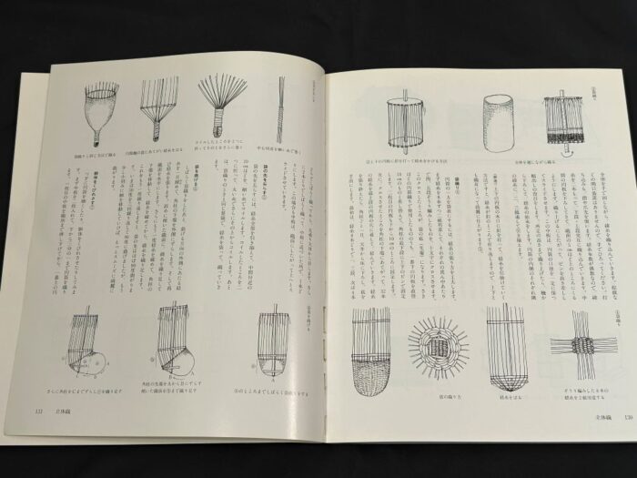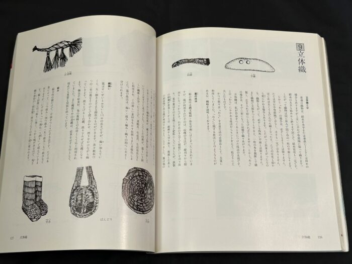 さまざまな織機を使った綴織や絣、着物の制作の章に続き、「立体織」について詳細に書かれています。織物は平らであっても実は立体です。たて糸の間をよこ糸が行き来しています。しかしほとんどは平らに織られます。先生は日本各地の藁でつくられた日用品である蓑、わらじ、ばんどり、雪沓などを見てまわったことをきっかけとして綴織を立体的に織り進める方法を考案されました。