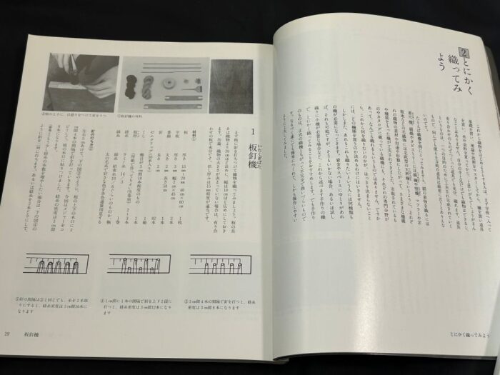「はじめに ―織物前史」では織物に関わってきた経験からの視点で「やきものが先か 織物が先か」また「人類最初のメカニズム」織物の始まりについて語られています。次の章は「とにかく織ってみよう」で、板に釘を打ってたて糸を張り、綴織を織る方法が紹介されています。織物といえば織機に座ってパッタンパッタンと織るものと思っていた私には衝撃の内容でした。大掛かりな織機がなくても織物は誰にでもできる、ここに小名木先生の織物に対する考えが明確に表れています。