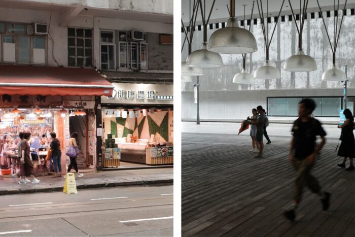 左:市場でよく見られる赤いランプシェード、右:M+の照明(筆者撮影)