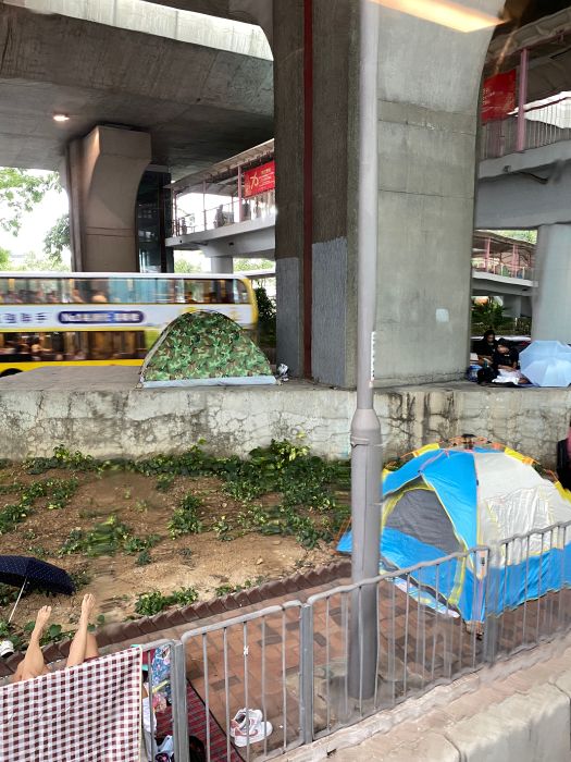 家政婦たちがテントを張りくつろぐ高架下(筆者撮影)