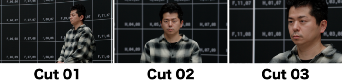 例えば、人物を正面から撮影したカットの次に、ほぼ同じ位置・ほぼ同じ角度から撮った映像をつないでしまうと、視聴者には「カットが変わった」というより、カメラが急にズレたように感じてしまいます(図2)