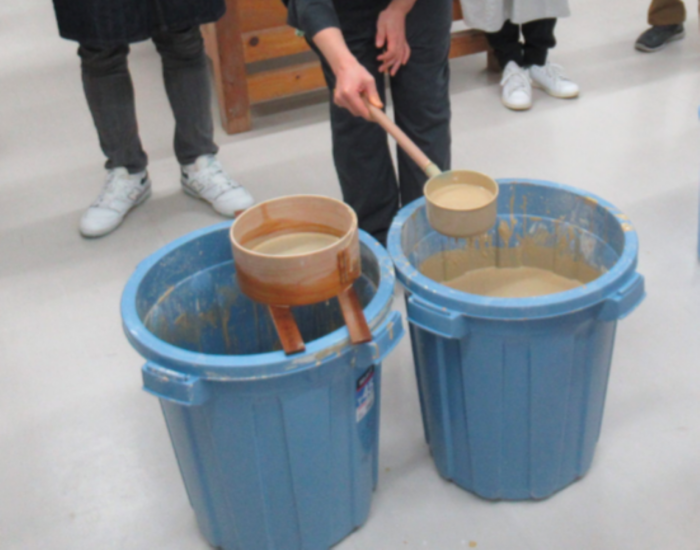 泥漿をしっかりと攪拌し、篩に通し使用します。さて、泥漿ができました。
