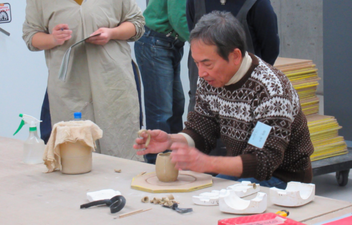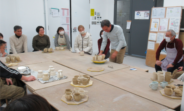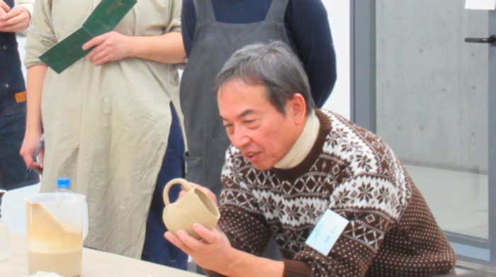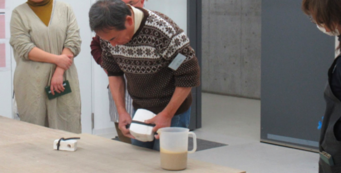 思い思いに作られた作品を前に、皆さん失敗談や発見をした魅力など、談笑も交えつつ、意気揚々としておられました。型をハンドルと本体とを分けた理由の一つには離型の問題があるのですが、せっかく分けて制作をした型を生かし、ハンドルを違う場所に敢えてつけてみたりされている方もおられました。