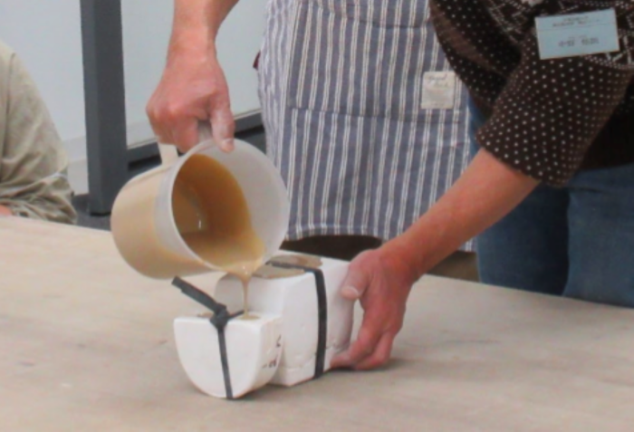 本スクーリングでは割型を使用しているため、泥が逃げないようしっかりとゴムベルトなどを使用し型を固定し、泥漿を流し込みます。