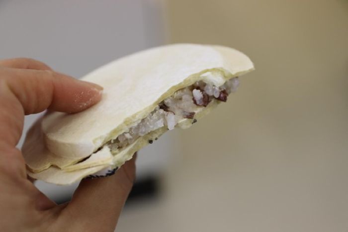 せんべいおこわは赤飯サンド、こびりっことも呼ばれます。クリスピーさの中にもちもちがひそむ、すばらしい食感です。