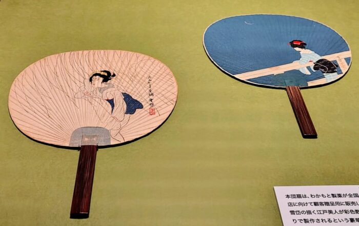 小村雪岱画、わかもと京団扇「新月」(右)と「そよ風」(左)木版、1939年、川越市立美術館蔵
