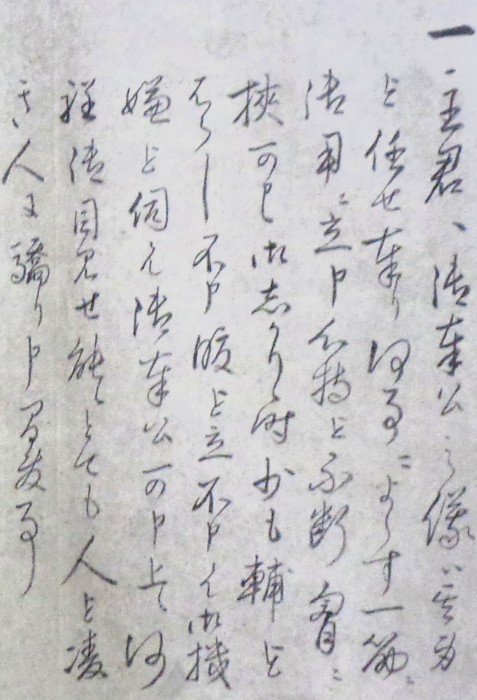 冒頭が「主君」なのがわかるでしょうか(「主」は前回「くずし字を読む③」の「王」などと似ていますね)。そのあとにある「ヽ」のような文字はひらがなの「へ」。続く文字はちょっと難しいですが「御奉公」で、つまり主君への奉公に際しての戒めです。